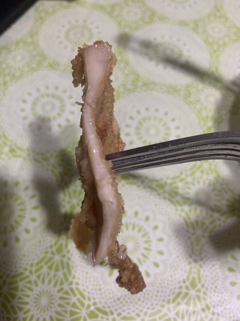 但吃的時候,感覺炸衣像浸滿油的海綿,咬下去冒出油汁。