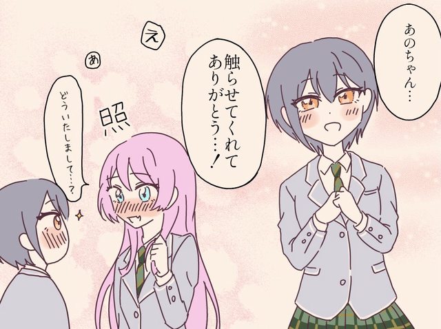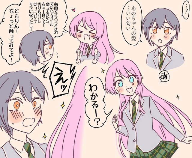 燈:小愛的頭髮,味道好香 愛:看得出來嗎?我用了影片推薦的髮油,超棒的!味道很香頭髮也變得又柔又滑,tomori n要摸摸看嗎? 燈:欸?
