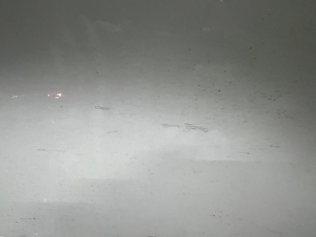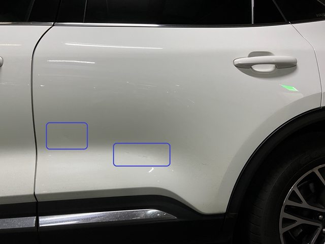 惟交車第一年於高速公路內側,行駛中遇跳石擊中駕駛側後門,傷痕如下