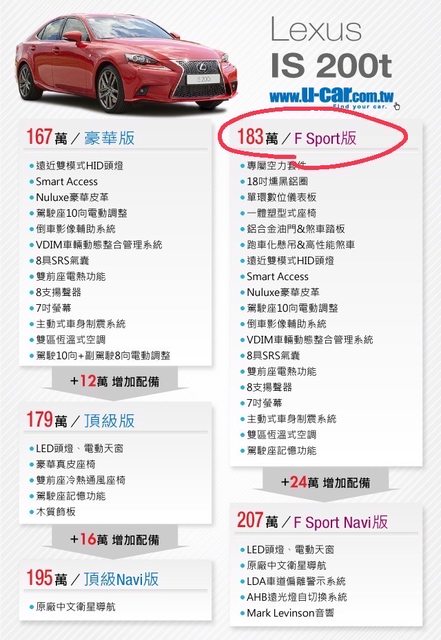 車款型式/排氣量: IS 200t F sport版/1998cc