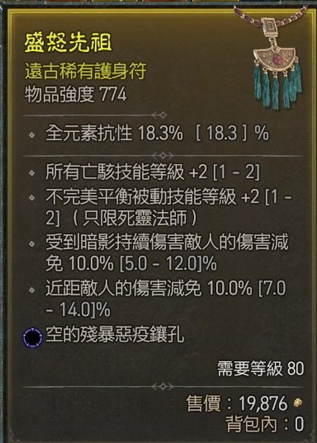 物 品:遠古項鍊 不完美+2 亡骸+2 暗影減免10% 近距離減免10% 藍孔