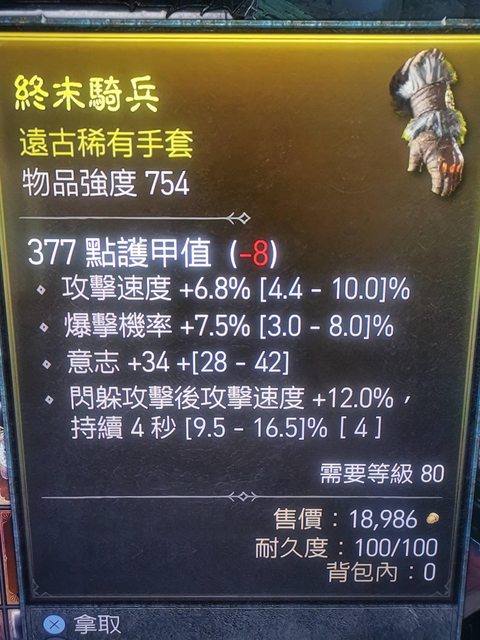 標題Re: [競標] D4 S1 爆盾手套。 攻速/爆率/閃後加攻速/