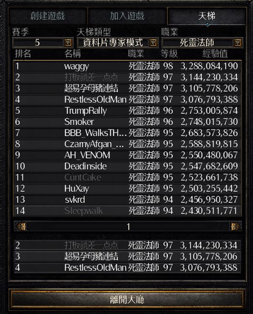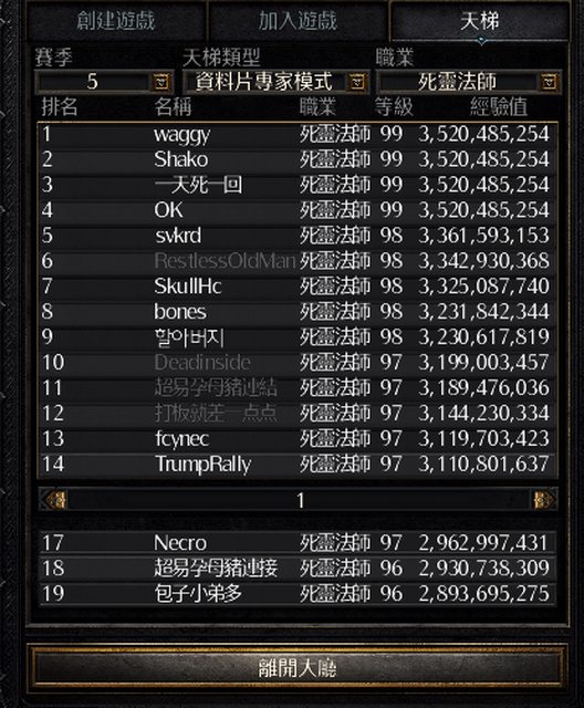 這是一張賽季中期截的圖,可以看到死靈法師前段班的死亡率非常高,甚至比其他