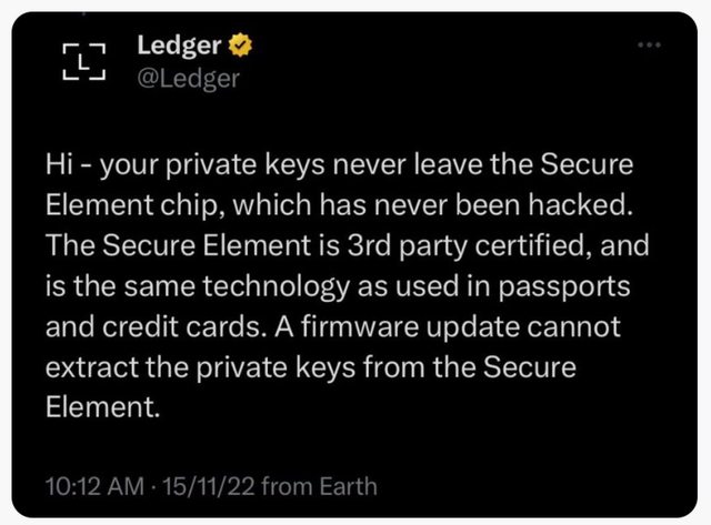今天只要Ledger願意 它可以出一個韌體更新導出私鑰(*號稱加密過)