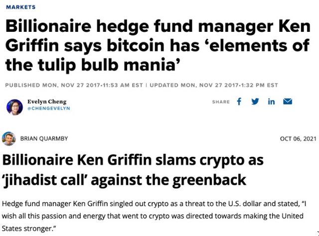 2017年 Citadel 的CEO, Ken Griffin, 說比特幣就是鬱金香泡沫