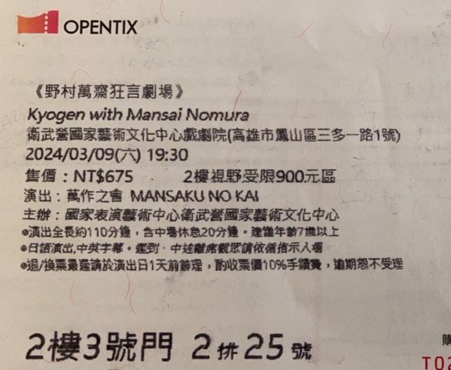 位置:2樓3號門-2排25號(視野受限區)