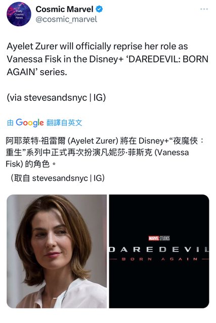 Ayelet Zurer將在 Disney+《夜魔俠:重生》系列中正式再次扮演Vanessa Fisk 的角色