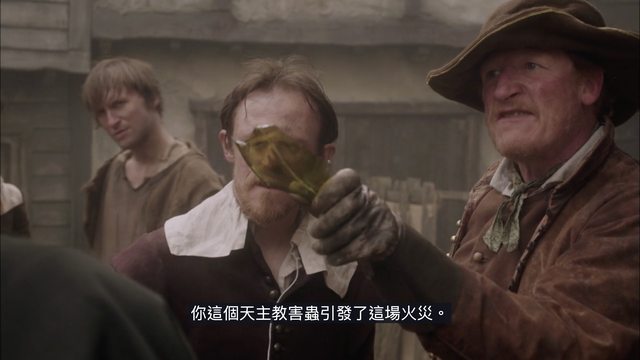 本劇也很像《鐵達尼號》的是大難當頭好多人竟視若無睹,渾然忘了逃命最大 XD 竟紅了雙眼劍拔弩張要來算舊帳!比起《鐵達尼號》衝突背景是 19/20世紀之交的「英國階級」,本劇 1666 民智未開人人還只懂得「宗教戰爭」:我們英國就是新教國家不歸羅馬天主教,這本是信仰問題卻漸成國族問題爭自己主權,現在外敵法國荷蘭雖並非全是天主教 (!)但鄉民們也傻傻分不清,只知既然「外有強敵」那我們倫敦大火必是「境外勢力」勾結「在地協力」搞恐怖攻擊!當然庸碌鄉民一開始逃命要緊也不會想到這環,但聰明政客聞到風向很快就知如何煽動「仇外」與「獵巫」。