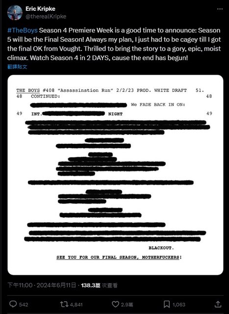 ,日前就在他的Twitter(現稱X)貼文上曬出本季結局的劇本,同時更宣布確認續訂開發