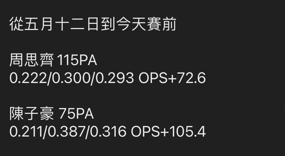 推 asdrt: 是說周打龍是很好啦. avg.333 obp .438 ops+185 08/11 16:59