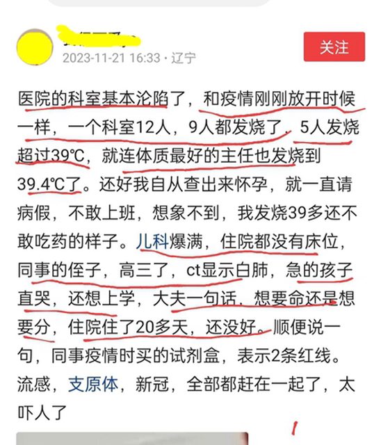 11月21日,遼寧一名護士在社交媒體發貼文說,她所在醫院的兒科爆滿,同事的侄子高三