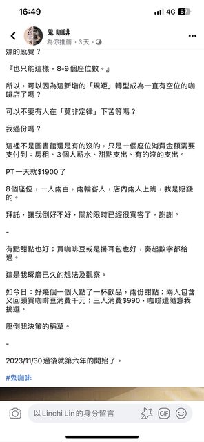 噓 JudgmentLin: 點一杯咖啡坐4個小時 不用做別人生意 110.28.137.51 11/26 12:51
