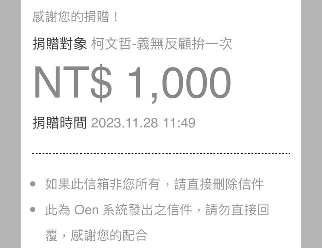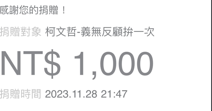 噓 michael0216: 才1000,真窮酸,這種捐法連柯狗 36.225.116.69 11/28 23:06