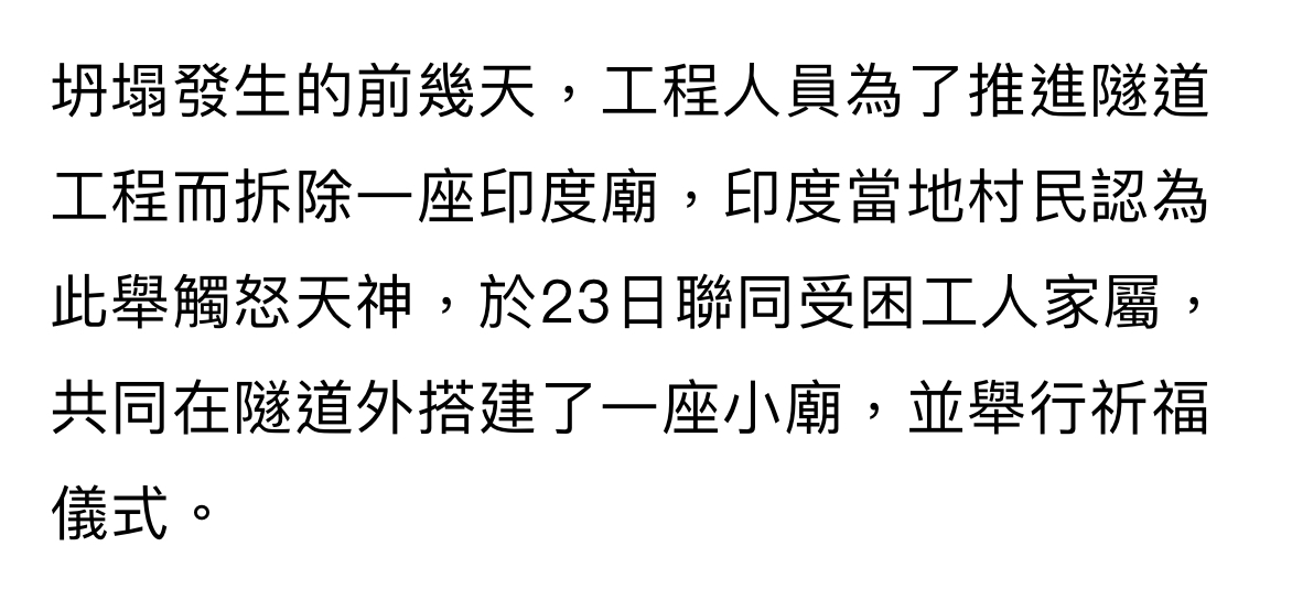 坍塌發生的前幾天,工程人員為了推進隧道工程而拆除一座印度廟,印度當地村民認為此舉
