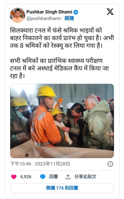 分鐘後,其餘工人都順利脫困,北阿坎德省(Uttarakhand)省長達米(Pushkar Singh Dha