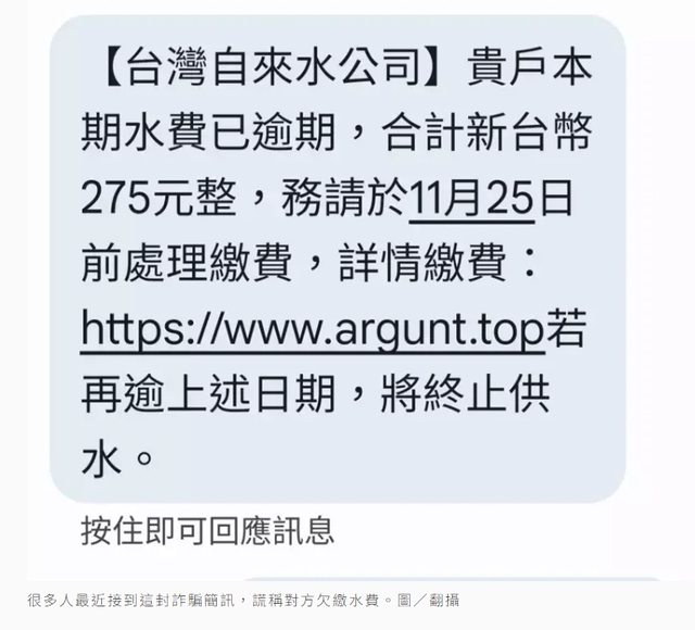 民眾接到的詐騙簡訊,騙稱住戶水費沒繳已逾期,需繳275元新台幣,11月24日前需繳費