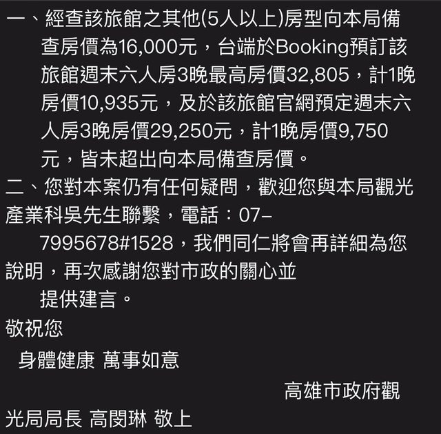 昨天寄信給高雄觀光局檢舉旅宿業者哄抬房價