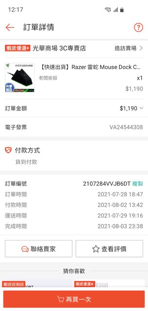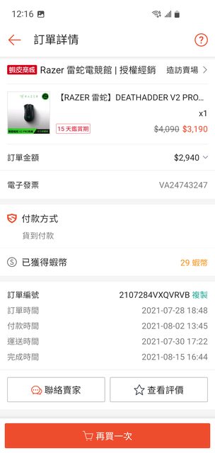 1. 2021/07/28 於蝦皮 Razer雷蛇電競館購入,保固2年