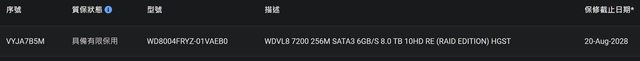 1、WD8004FRYZ,保固至2028/8