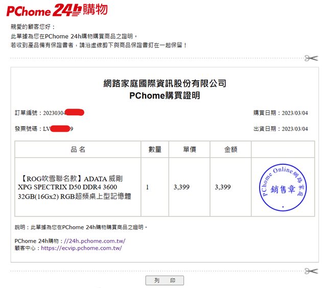 1.2023/3/4 PCHome購入有發票,記憶體永久保固
