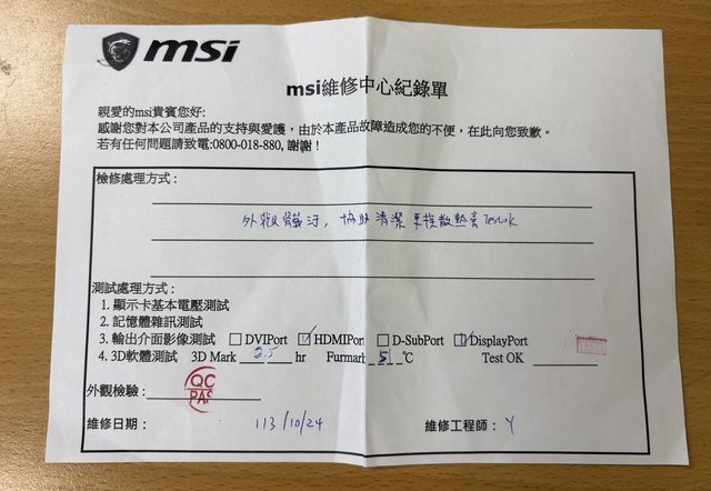保固到2025/10 背板有刮痕如圖 已送回原廠清潔及重上散熱膏