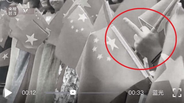視頻中的人員大多都強顔歡笑,「熱烈地」搖動手中的小血旗。不過在視頻12秒處出現「