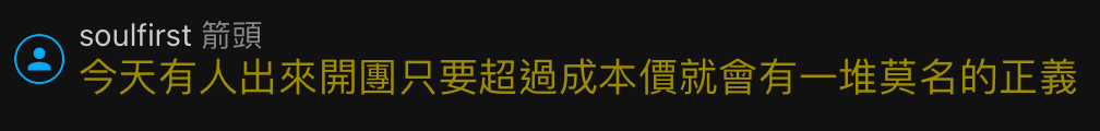 → soulfirst: 今天有人出來開團只要超過成本價就會有一堆莫名的正義 09/19 05:11