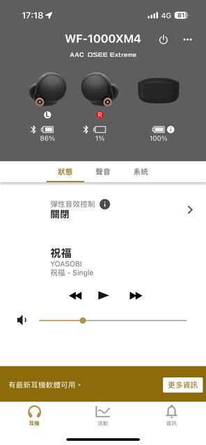 最近有一小段時間沒有使用耳機,在昨天9/26要用時發現才聽4分鐘左耳就剩86%右耳剩1%