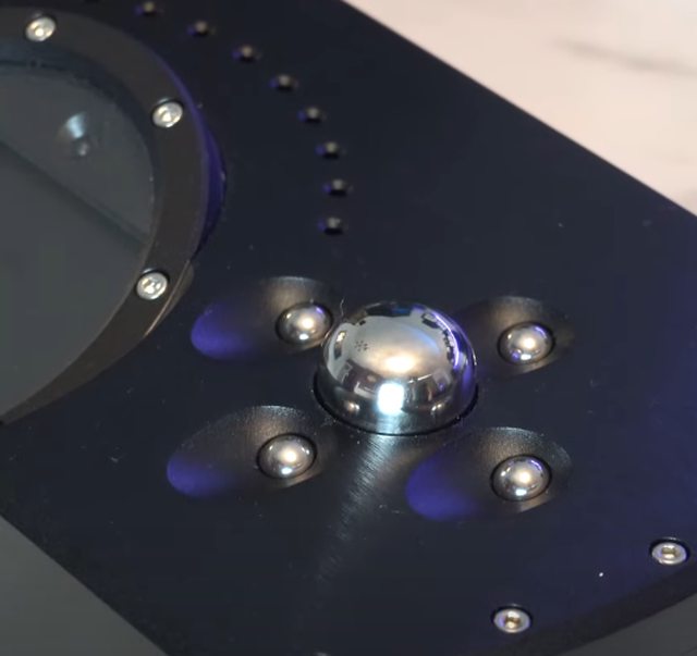 在前方右邊有四個按鈕分別在上下左右,中間有大顆數位音量旋鈕,旋轉控制音量大小,按