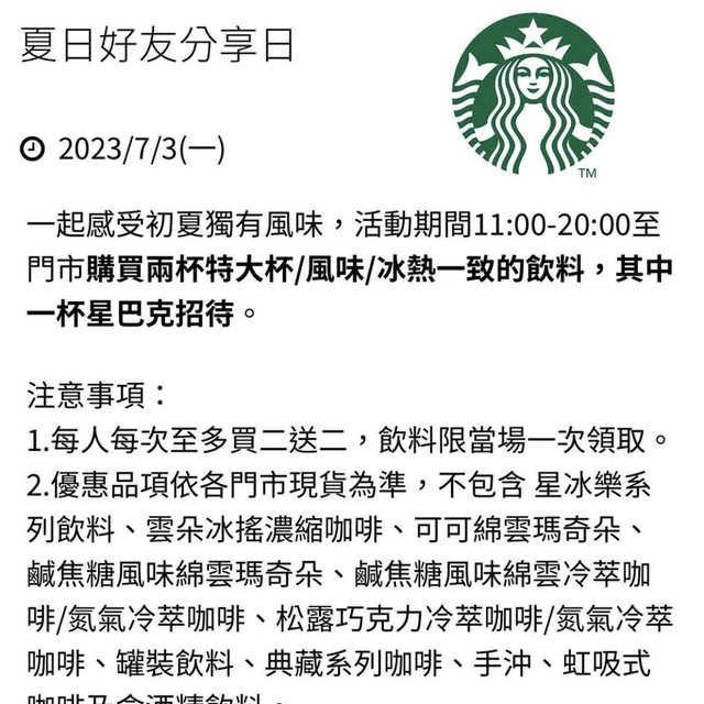 徵求星巴克買一送一 特大杯