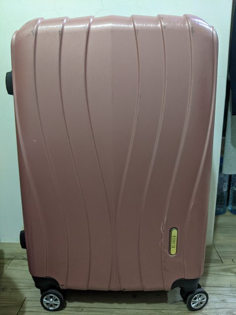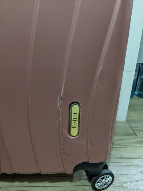 物品項目:24吋信用卡贈送還堪用行李箱,拉桿輪子皆正常,箱面有小裂痕(如圖)和使用痕跡,不介意者再自取