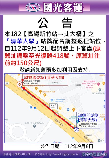9/12起,市區公車站 (清大對面,往市區)遷移至十六區和風料理門口
