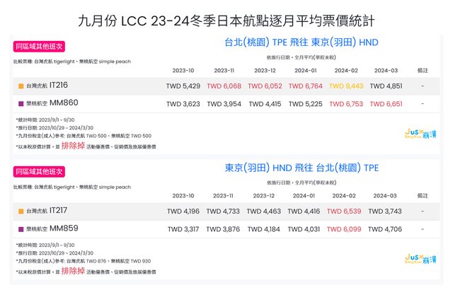 標題[分享] 9月份 LCC 23冬逐月平均票價統計