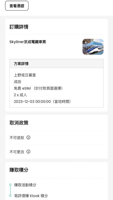 標題[讓售] Klook Skyliner 上野到成田 兩張 期限到 2024/05/03