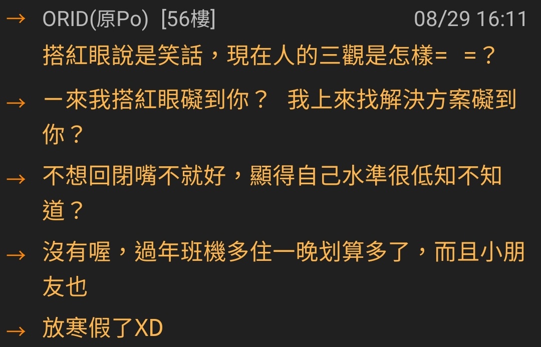 → ORID : 搭紅眼說是笑話,現在人的三觀是怎樣= =? 08/29 16:11