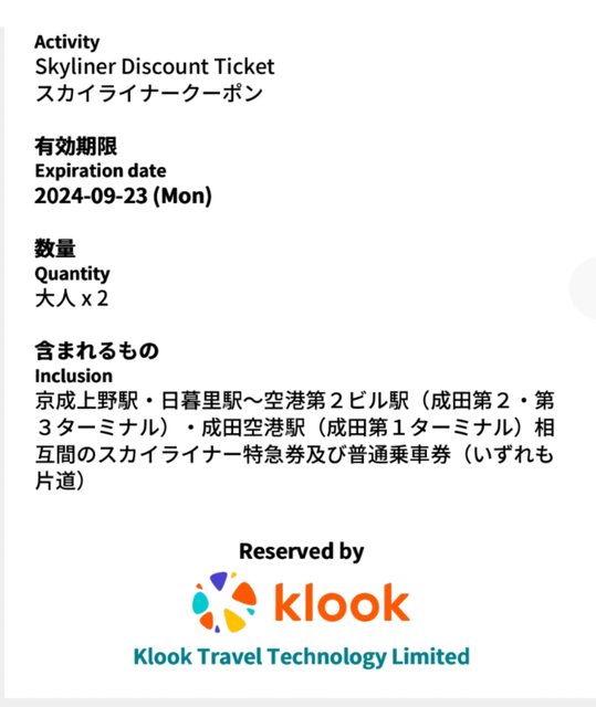 京成Skyliner 上野至成田機場兌換券2張 期限至2024/09/23