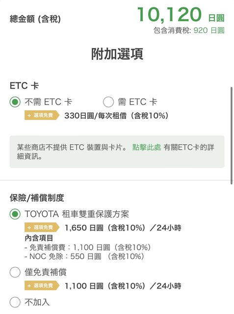 Q2:請問TOYOTA官網跟tabirai 的保險方案是不是後者少保一個NOC,如果需要現場再加保就好(不過官網訂好像比較便宜一點)
