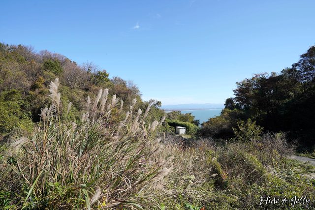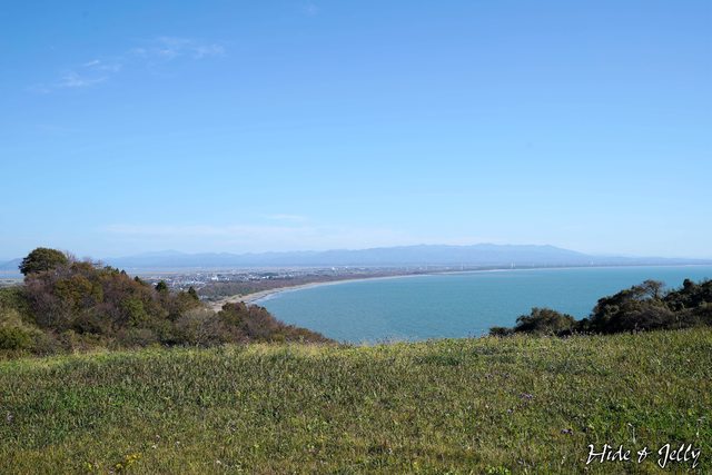 東側則可以遙望「出戶浜」的海岸弧線,海岸線上的風力發電機,也清晰可見。
