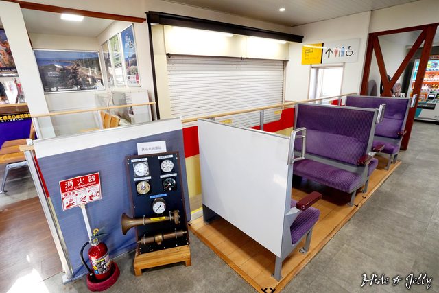 站內連休憩區都是舊列車拆下來的座椅,還有電車指示錶、喇叭(霧笛)的展示。