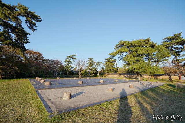 走過連絡橋,進入政廳的範圍後,馬上可以看到「正殿」的礎石跡,目前則以挖掘回填後