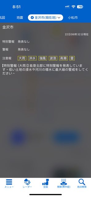 回來之後才發現鄰近的能登半島大雨淹水 難怪9/21.22的天氣警報一直跳
