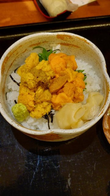 晚餐找到一家有停車場的料亭,發現雙色海膽蓋飯比三角市場裡便宜。
