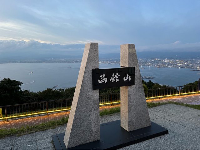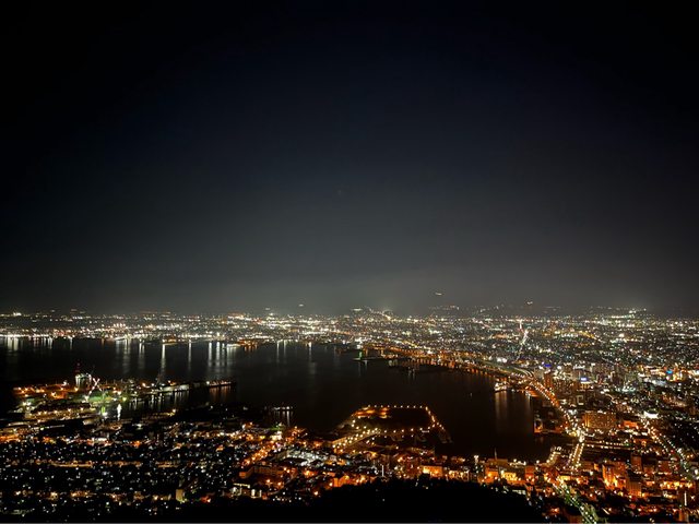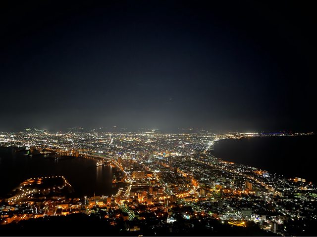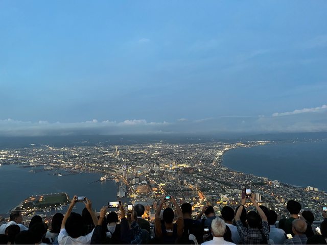 還好遊客來來去去,我們終於前進到第一排,幸運看到城市點點燈光所形成的函館山百萬