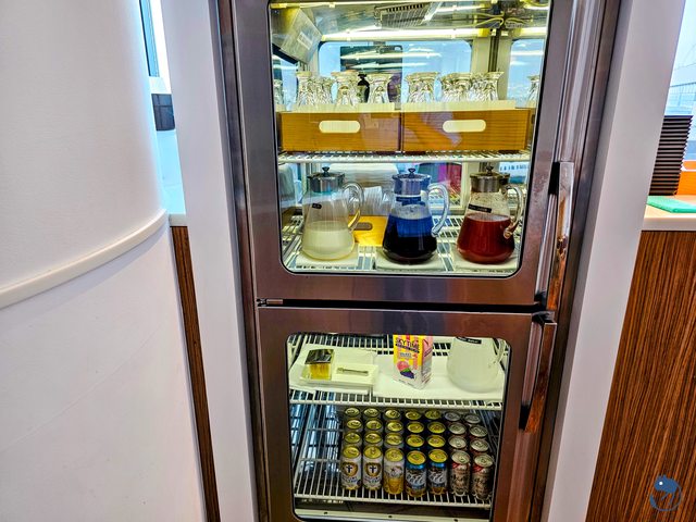 冰箱裡有烏龍茶、牛奶、番茄汁、寶礦力、日航限定飲料Skytime與啤酒,冰箱上側是冰