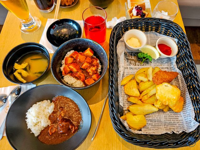 小咖哩飯、麻婆豆腐丼與炸魚薯條,甜點先點個藍莓醬Trifle蛋糕。