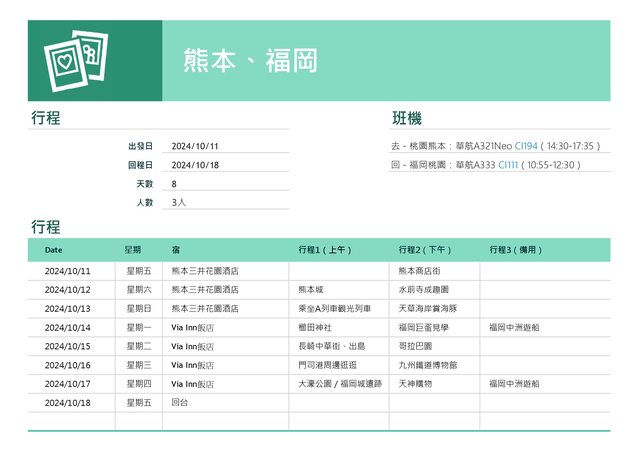 已經把行程表放在最上面的連結,熊本三天,福岡五天共8天7夜