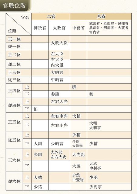 又細分為正位與從位。六位以上稱為「貴族」;而三位以上,以及四位的參議則被稱為「