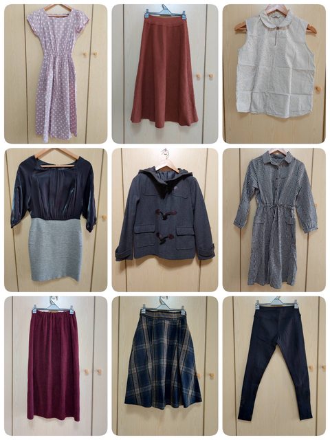 物品狀況:二手衣物,尺寸S~M。有夏天背心也有冬天外套長裙,earth牛角外套鈕釦處