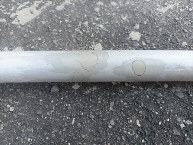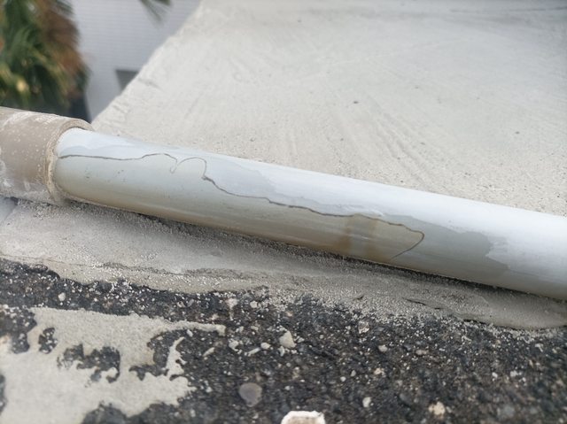 我揚水管被水泥潑濺時也未即時清潔,導致多處硬化沾黏,