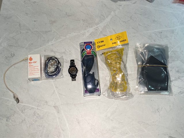 物品名稱:哀鳳線、護膚油、髮圈、手錶、泳鏡600度、護目鏡、口罩